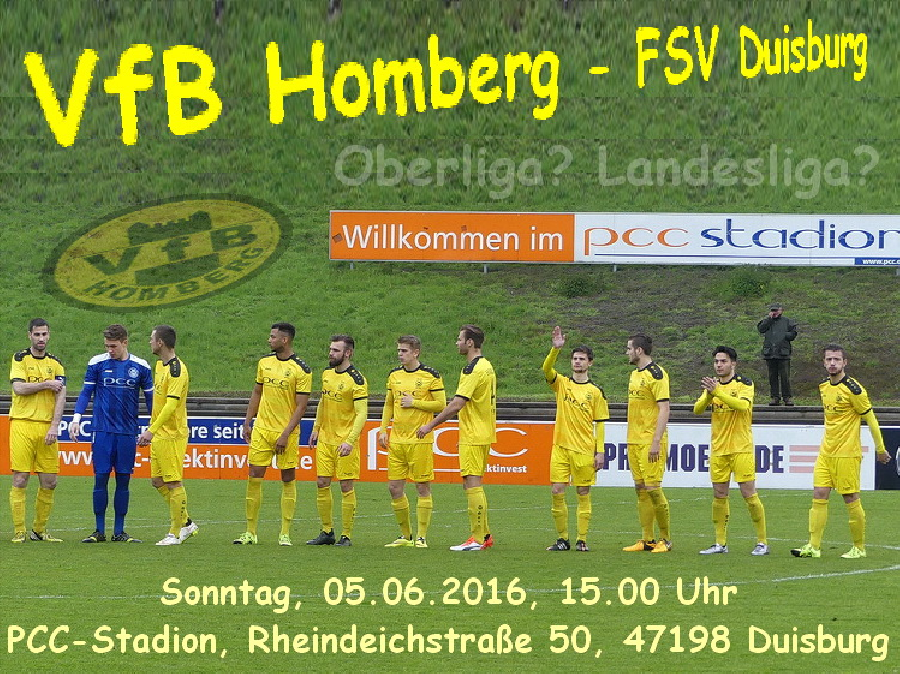 Finale! Am Sonntag entscheidet das Derby zwischen dem VfB Homberg und dem FSV Duisburg über den direkten Aufstieg in die Oberliga Niederrhein: Der Sieger wird Meister und Oberligist, der Verlierer muß nach Kleve schielen und hoffen, daß der Duisburger SV 1900 in der Schwanenstadt punktet - dann darf man über die Relegation gegen den Cronenberger SC weiter hoffen. Bei einem Unentschieden würde das Team von Trainer Stefan Janßen aufsteigen, die Gäste wären vom Ausgang des Spiels in Kleve abhängig. Die personelle Konstellation - mit dem Trainerduo Günter und Volker Abel sowie Sturmtank Almir Sogolj treten drei ehemalige Homberger für die Hamborner an, die 2010 am VfB-Aufstieg in die NRW-Liga beteiligt waren - verleiht der Partie zusätzlich eine besondere Note. Doch die Vergangenheit zählt am Sonntag nicht, es geht um die nahe Zukunft: Oberliga? Landesliga? Es wird spannend.