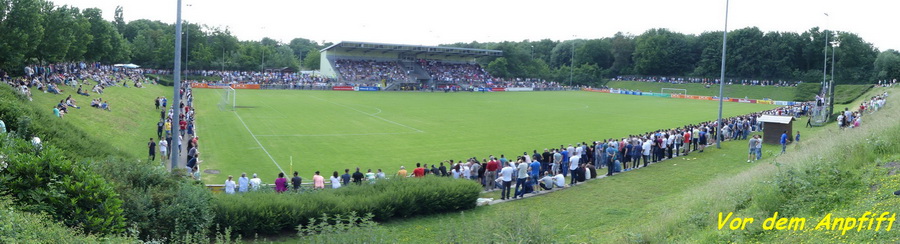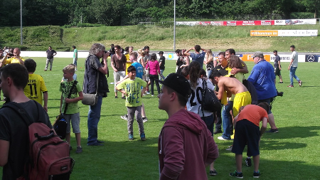 3.500 Zuschauer lockte das Spitzenspiel ins PCC-Stadion, niemand mußte sein Kommen bereuen: Beide Teams warfen alles in die Waagschale und boten spektakulären und - trotz der enormen Bedeutung der Partie - fairen Landesliga-Fußball. Sunay Acar brachte die Gastgeber mit einem an Sergen Sezen verwirkten Foulelfmeter in Führung, Sebastian Santana traf unmittelbar nach dem Wiederanpfiff zum 2:1. Nachdem die Gäste das Spiel vermeintlich gedreht hatten, sorgte Matchwinner Santana mit dem willensstark erzwungenen 3:3 für den eminent wichtigen Ausgleich. Marcel Kalski legte ähnlich konseqent das 4:3 nach - nach dem Abpfiff zeigte das Team von Erfolgstrainer Stefan Janßen nach einer grandiosen Saison, daß es nicht nur ansehnlichen und erfolgreichen Fußball spielen und leidenschaftlich kämpfen kann, die Truppe kann auch toll feiern.
