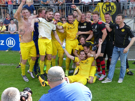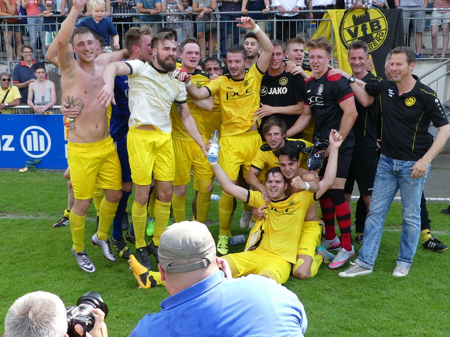 Geschafft! Dank eines 4:3-Erfolgs gegen den FSV Duisburg hat der VfB Homberg den sofortigen Wiederaufstieg in die Oberliga Niederrhein geschafft und nach dem Abpfiff die Korken knallen lassen. Die Gäste dagegen stehen nach 34 Spieltagen mit leeren Händen da, der 1. FC Kleve rutschte durch ein Tor in der Nachspielzeit in die Relegation gegen den Cronenberger SC.