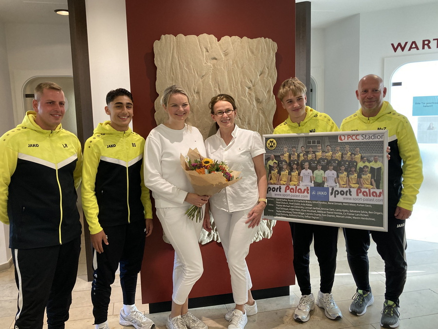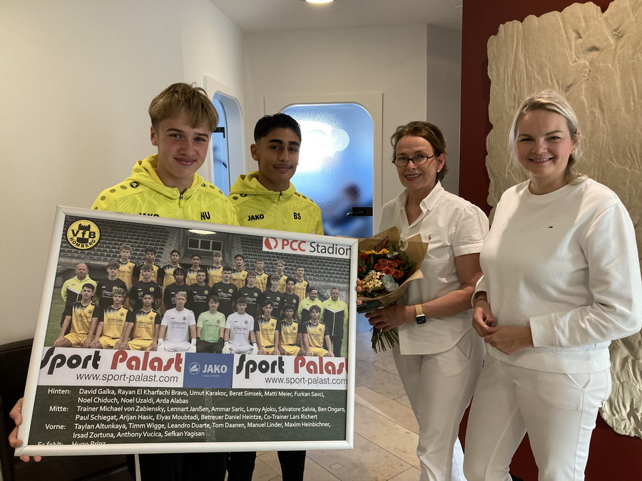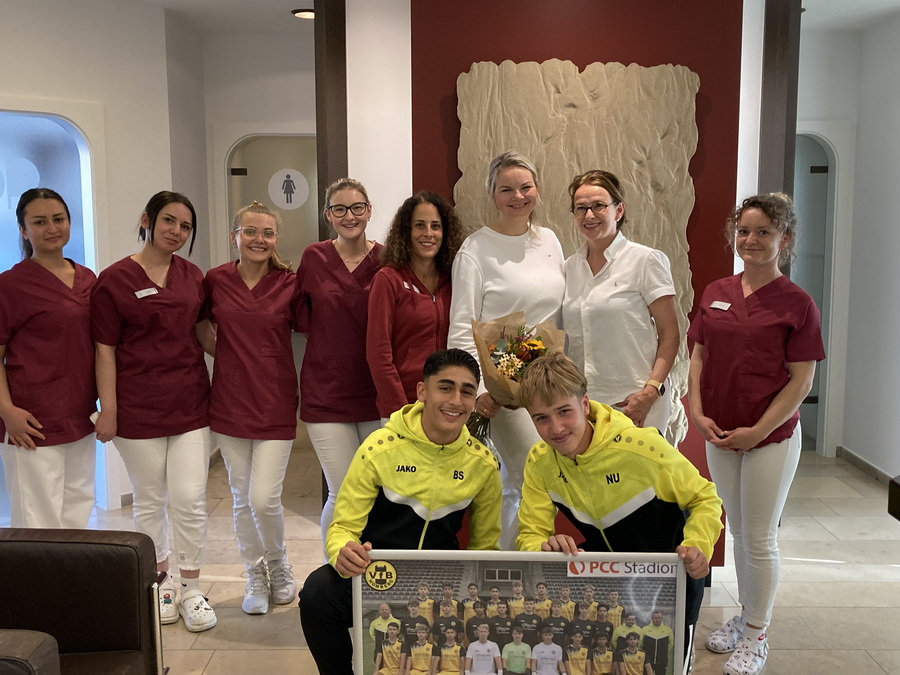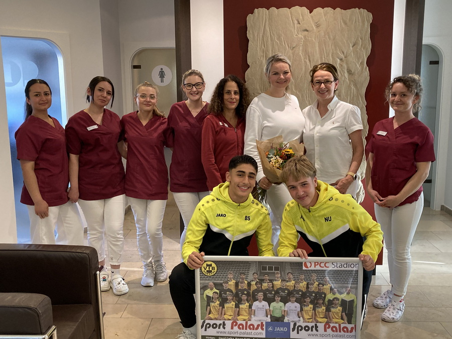 Vor der Saison erhielt die Mannschaft von der Zahnärztlichen Gemeinschaftspraxis Dr. Anja Ch. Erdmann, ZÄ Caroline Potyka & Kollegen zwei tolle neue Trikotsätze. Jetzt hatten Trainer Michael von Zabiensky, Co-Trainer Lars Richert sowie die Spieler Noel Uzaldi (Mannschaftskapitän) und Berat Simsek die Gelegenheit, sich bei dem Praxisteam für diese bärenstarke Aktion zu bedanken.