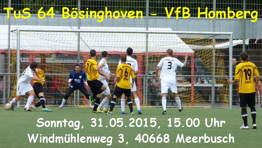Das letzte Auswärtsspiel der Oberliga Niederrhein 2014/2015 führt unsere Mannschaft am Sonntag zum TuS 64 Bösinghoven. Der Club aus dem Meerbuscher Vorort ist mittlerweile aller Abstiegssorgen ledig, während der VfB Homberg den bitteren Gang in die Landesliga antreten muß. Dennoch werden die Gelb-Schwarzen versuchen, bei den Schwarz-Gelben eine ordentliche Leistung abzuliefern und nicht mit leeren Händen an den Rheindeich zurückzukehren. Das Hinspiel ging 2:3 verloren, Hakan Dönmez und Almir Sogolj trafen damals für die Gastgeber.