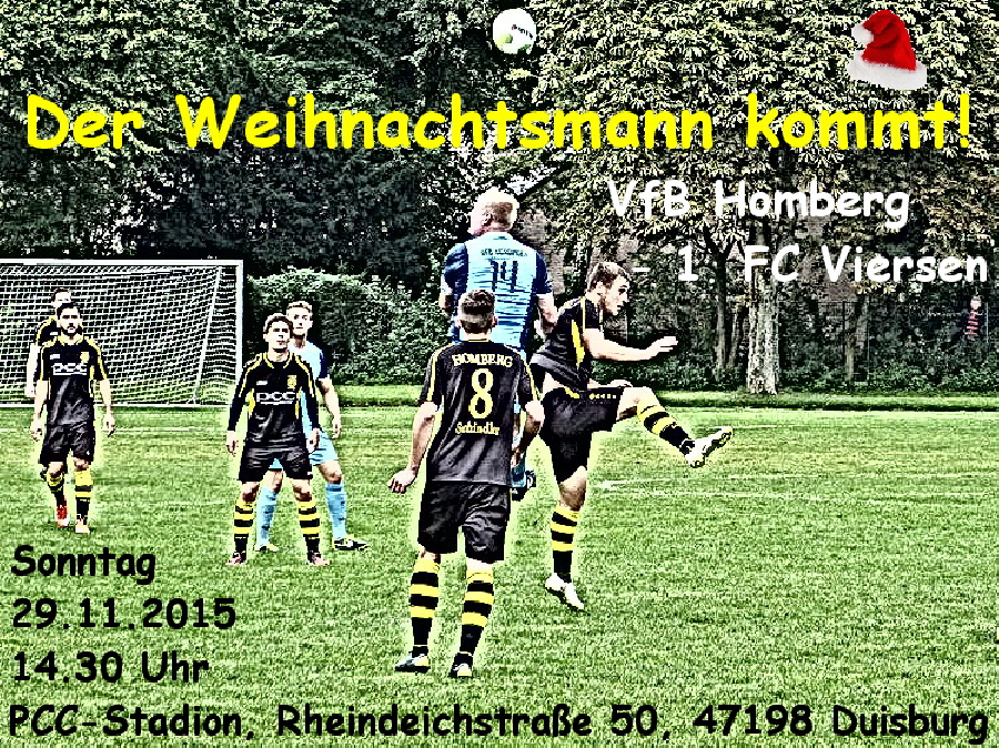 Der Weihnachtsmann wird am ersten Adventssonntag im PCC-Stadion erwartet, vor dem letzten Landesliga-Heimspiel des Jahres 2015 wird an jede Zuschauerin und jeden Zuschauer eine kleine Aufmerksamkeit verteilt. Fußballerisch steht die Aufgabe gegen den 1. FC Viersen auf dem Programm, der zuletzt in unserer Aufstiegssaison 2009/2010 am Rheindeich zu Gast war. Das Team vom hohen Busch liegt aktuell als Tabellenachter sechs Plätze hinter den Gelb-Schwarzen und hat insgesamt die wenigsten Gegentreffer der Liga hinnehmen müssen. Gerade gegen die Spitzenmannschaften haben die Viersener bemerkenswerte Ergebnisse erzielt, so wurde der FSV Duisburg zu Hause 3:0 geschlagen oder bei Union Nettetal 1:0 gewonnen. Zuletzt gab es eine 1:3-Niederlage bei Tabellenführer 1. FC Kleve, bei der den Viersenern von allen Seiten eine starke Leistung bescheinigt wurde. Unsere Mannschaft hat also keinen Grund, den Gegner zu unterschätzen. Die beeindruckende Serie von zuletzt sieben Siegen und einem Unentschieden ist zwar erfreulich, aber letztendlich unbedeutend - entscheidend wird wie immer die Leistung auf dem Platz sein. Wenn sich das Team von Trainer Stefan Janßen so weiterentwickelt, wie es seit dem Saisonbeginn der Fall ist, dann ist natürlich auch gegen den 1. FC Viersen ein Sieg drin - und darauf hoffen Spieler, Trainerteam und Verantwortliche genauso wie die Fans.