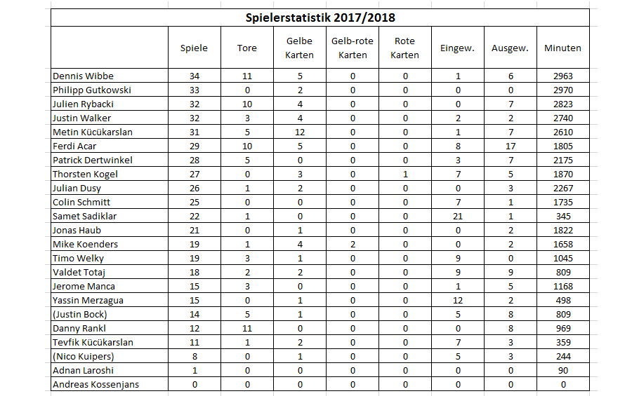 Die meisten Treffer erzielten Dennis Wibbe und der erst im Winter gekommene und anfangs mit einer Verletzung kämpfende Danny Rankl, beide trafen elf Mal. Nur ein Tor weniger haben Ferdi Acar und Julien Rybacki auf dem Konto, drei Eigentore steuerten die Kontrahenten bei. Rybacki war außerdem einer der besten Vorlagengeber der Oberliga Niederrhein, Acar, Wibbe und Justin Walker sind in dieser Statistik ebenfalls gut plaziert.