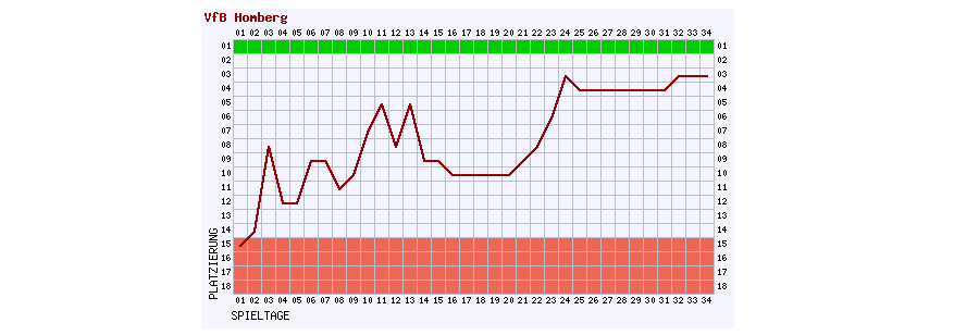 Saisonziel der Gelb-Schwarzen war der Klassenerhalt, doch nur einmal - nach der 0:2-Heimniederlage gegen die Sportfreunde Baumberg am ersten Spieltag - belegten die Homberger einen Abstiegsplatz. Danach hielt man sich lange im Mittelfeld auf, um letztendlich mit einem starken Schlußspurt auf dem "Bronze-Platz" zu landen: