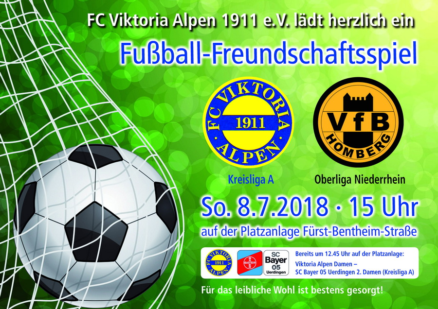 Schon am Sonntag geht es weiter: Bei Viktoria Alpen trägt unsere Oberliga-Mannschaft ihr zweites Vorbereitungsspiel aus. Die Gastgeber waren in der abgelaufenen Saison Ligarivale unserer Reserve in der Kreisliga A, spielten eine starke Runde und landeten am Ende auf Rang drei. Die Partie findet auf dem Rasenplatz der modernen Platzanlage der Viktoria statt, für das leibliche Wohl wird bestens gesorgt und die Meteorologen versprechen herrliches Sommerwetter.