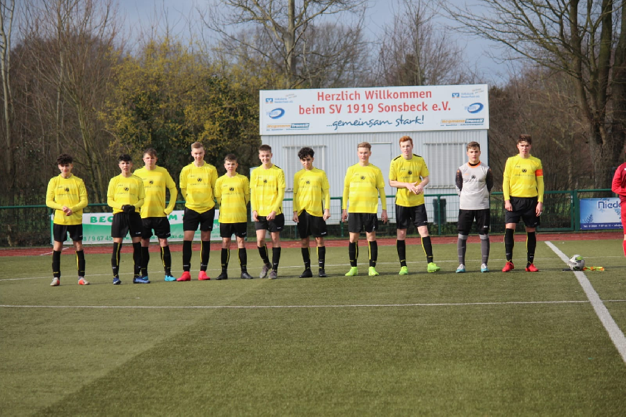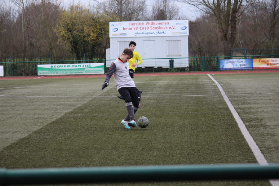 Heute endete auch für die U17 die Winterpause. Im ersten Spiel in der Meisterschaft führte der Weg zur Mannschaft der Spielgemeinschaft JSG Sonsbeck/Kapellen. In der Hinrunde verzichteten die Gastgeber ja auf die Austragung der Begegnung und heute war der Leistungsunterschied beider Mannschaften mehr als deutlich. Von Anfang an wollte die Spielgemeinschaft das Ergebnis nur in Grenzen halten. Kein einziges Mal während der Spielzeit gelangten die Gastgeber spielerisch in unserer Hälfte. Einzig durch Befreiungsschüsse oder durch Rückpässe unsererseits hatte unser Torwart mal einen Ballkontakt. In der ersten Hälfte spielte unsere Mannschaft aber teilweise zu umständlich und zu langsam. Trotzdem erzielten wir bis zur Pause vier Tore. Nach der Pause erhöhten unsere Jungs das Tempo und schraubten das Ergebnis bis zum Schlusspfiff auf 11:0 hoch. Ein auch in dieser Höhe verdienter Sieg der leicht noch hätte höher ausfallen können/müssen. Glückwunsch!