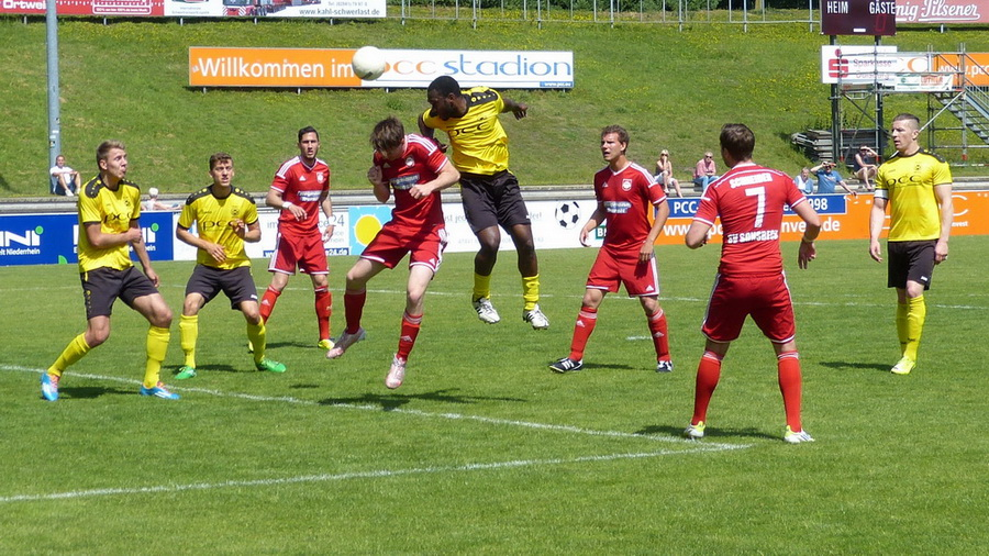 Am letzten Oberliga-Spieltag der Saison 2014/2015 trafen heute die beiden feststehenden Absteiger VfB Homberg und SV Sonsbeck aufeinander, nach 90 Minuten hieß es im PCC-Stadion 0:2 (0:1). Damit belegen die Gelb-Schwarzen in der Abschlußtabelle den letzten Platz, daran hätte allerdings auch ein Heimsieg nichts geändert. Vor dem Anpfiff verabschiedete Abteilungsleiter Wolfgang Graf das langjährige Trainergespann Günter Abel, Volker Abel und Oliver Adler, den Physiotherapeuten Phillip Niederholz sowie die Spieler Jura Adolf, Muhamet Attris, Fabian Hastedt, Martin Hauffe, Dennis Konarski, Simon Kouam Kengne, Athanasios Mitrentsis, Ognjen Petrovic, Patrick Polk, Jonas Rölver, Sebastian Schweers und Dominik Weigl. Auch Albert Gashi verläßt den VfB Homberg, hält sich aber derzeit in seiner Wahlheimat Norwegen auf.