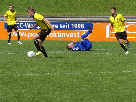Trainer Stefan Janßen schickte mit Jerome Manca, Florian Witte, Justin Bock und Jonas Rölver vier Neuzugänge auf das Feld, auf der Bank nahmen u.a. Oguzhan Cuhaci, Sebastian Santana und Stefan Schindler Platz. Die Homberger beherrschten den Gegner über 90 Minuten nach Belieben, Keeper Philipp Gutkowski mußte sich nur ein einziges Mal "lang machen" - die souverän und selbstbewußt agierenden Innenverteidiger Thomas Schlieter und Timo Welky hatten alles im Griff. Vor dem Tor des Landesligisten, der sich dankenswerterweise für die kneifende Westfalia aus Herne zur Verfügung gestellt hatte, war dagegen jede Menge los. Florian Witte hatte anfangs zwei Schußchancen, der agile Jerome Manca war mehr vorne als hinten unterwegs. Dennis Wibbe lieferte wie gewohnt eine überragende Laufleistung ab, kam aber nicht zum Abschluß. Nach Vorarbeit des bärenstarken Justin Bock traf dann Jonas Rölver zum 1:0, Marcel Kalski legte nach einem Abwehrfehler nach. Julian Dusy bereitete das 3:0 vor, Rölver war zum zweiten Mal am heutigen Tag erfolgreich. Nach einem Foul am vor Spielfreude nur so sprühenden Rölver verwandelte Kalski den folgerichtigen Foulelfmeter sicher - der Halbzeitstand gab den Spielverlauf nicht wieder. Nach dem Seitenwechsel traf Thorsten Kogel zum 5:0, dann sorgten Dusy und Bock auf der rechten Seite für Wirbel, die Hereingabe verwertete Kalski mit einem sehenswerten Hechtsprung per Kopf. Nach dem 7:0 durch Rölver wechselte Coach Janßen gleich sechsmal aus, nach Robin Webers toller Vorarbeit stellte Metin Kücükarslan den Endstand her. Auch wenn der Gegner nicht seinen besten Tag erwischt hatte: Die Leistung der Gelb-Schwarzen war mehr als ansehnlich und acht Tore muß man erst einmal schießen. Die Oberliga-Saison kann kommen.