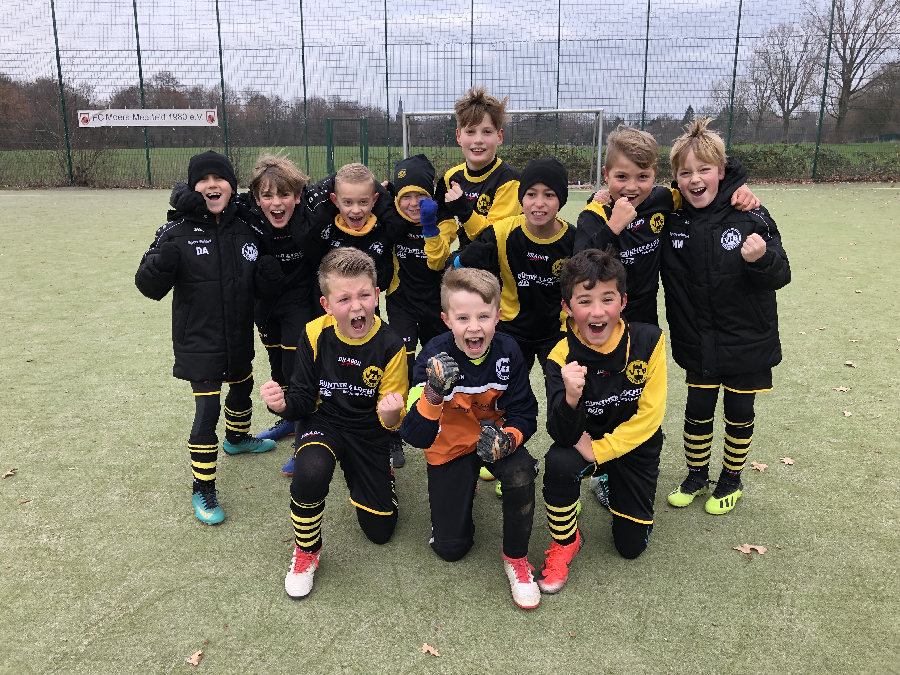 Die erste Überraschung schon vor dem Anpfiff. Gespielt wurde nicht, wie erwartet, auf Asche, sondern auf dem kleinen früheren Kunstrasenplatz. Der Sand, den man reichlich gestreut hatte verringerte die Standfestigkeit der VfB Kicker und brachte unserem Kombinationsspiel deutliche Nachteile. Aber zum Spiel: Der Gastgeber hatte sich, deutlich spürbar, einiges für heute vorgenommen. Hierbei kam dem FC Meerfeld das, vorallem in der Breite, kleinere Spielfeld zugute, da man mit den mindestens um einen Kopf größeren Vorteil der eigenen Spieler das enge Feld noch mehr zustellen konnte. Meerfeld drückte und Homberg versuchte zunächst über eine stabile Defensive das eigene Kombinationsspiel aufzubauen. Schon in der zweiten Minute fiel der aus Homberger Sicht unglückliche erste Gegentreffer. Ein Distanzschuss landete im Torwinkel. Elias hatte zwar die Fingerspitzen noch dran, doch reichte es nicht für eine entscheidende Abwehr. Aber Homberg schlug direkt zurück und glich durch Julian schon eine Minute später aus. Ein Schnell vorgetragener Angriff über Mehdi landete beim frei stehenden Homberger 10er. Das 2:1 der Meerfelder folgte wiederum nur eine Zeigerumdrehung später. Die Homberger Defensive war nicht eng genug am Mann und der Ball war drin. Die Homberger ließen aber wiederum den Kopf nicht hängen und in der 8. Minute war es wiederum Julian der einen unserer Angriffe zum erneuten Ausgleich abschloss. Nun ging es hin und her, wobei die Angriffsbemühungen beider Seiten häufig in der gegnerischen Abwehr zum Erliegen kamen. Der VfB spielte sich ein ums andere mal sehenswert nach vorne, während die Moerser es eher britisch versuchten. Die Homberger Defensive stellte sich auf die grundsätzlich lang geschlagenen Bälle immer besser ein, fing diese ab und kombinierte sich wiederum nach vorne. Auf beiden Seiten sicherten die Keeper noch je einmal ihre Mannschaft vor einem Rückstand. Während der Moerser Schlussmann einen Distanzschuss von Jasper, im Anschluss an eine Ecke, gerade noch parieren konnte, legte unser Elias ein absolut sehenswerte Flugeinlage ein und lenkte einen Winkelschuss noch um den Pfosten. Ähnlich lief es auch in der zweiten Spielhälfte ab. Gefährliche Einschussmöglichkeiten gab es auf beiden Seiten und auch jeweils 1 Lattenschuss war zu vermerken. Während die Homberger das Spiel immer besser in den Griff bekamen und man den Eindruck bekam, dass nur ein eigener Fehler dieses Spiel noch zu unseren Ungunsten hätte entscheiden können, wurde es auf dem Feld auch etwas ruppiger. Der Höhepunkt war dann Timo vorbehalten. In der 44. Spielminute nahm unsere Nummer 12 Maß und nagelte das Spielgeräte unter die Latte des Meerfelder Gehäuses. Nun ging es fast nur noch darum den knappen Vorsprung zu verteidigen. Dies gelang unseren Jungs verdientermaßen und der Jubel nach Abpfiff war riesig. Das gesamte Team hat heute eine super Leistung geboten. Ganz großer Dank aber auch an Deniz, Nico und Tim. Die 3 haben gezeigt, dass wir eine wahre Mannschaft sind und ihren Teil zum heutigen Erfolg beigetragen. Als Spitzenreiter mit nun 9 Punkten Vorsprung gehen wir ins Jahr 2019. Auch in diesem Jahr haben wir uns weiterentwickelt. Wir spielen Fußball. Wir sind eine Mannschaft. Wir haben Spaß zusammen. Von uns Trainern ein großes Dankeschön an alle Jungs und auch die Eltern für den tollen Support!