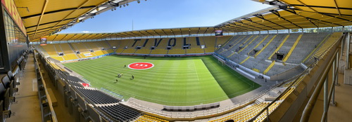 Trainer Stefan Janßen beließ Durim Berisha nach dessen starkem Debüt gegen Wuppertal in der Startaufstellung, für den genesenen Robin Urban - heute als rechter Verteidiger aufgeboten - mußte Marvin Lorch weichen, Koray Kacinoglu rückte ins Mittelfeld. Auf der Bank saß neben Lorch, Robin Offhaus, Cagatay Kader, Thorsten Kogel, Julien Rybacki, Colin Schmitt und Can Serdar auch Neuzugang Nurettin Kayaoglu, dessen Spielberechtigung rechtzeitig eingetroffen war. Das Spiel - in einem tollen Stadion vor einer beeindruckenden Kulisse - begann für die VfB-Fans mit einer Schrecksekunde, die Aachener hatten unmittelbar nach dem Anpfiff eine Doppelchance (u.a. Lattenschuß). Und es ging aus Sicht der Gastgeber vielversprechend weiter, David Bors vergab nach Flange von Robin Garnier (10.), Philipp Gutkowski reagierte glänzend gegen Steven Rakk (14.). Zwei Minuten später war der VfB-Keeper erneut auf dem Posten, den bärenstark abgewehrten Ball aber erreichte David Bors, der zum 1:0 vollendete. Nachdem Danny Rankl nach Anspiel von Justin Walker nicht abschließen konnte, verhinderte Gutkowski auf der anderen Seite Bors zweiten Treffer. Danach kamen die Gelb-Schwarzen besser ins Spiel, hatten aber Glück, als Florian Rüter aus kurzer Distanz über die Latte schoß (37.). Nach einer klasse Flanke von Robin Urban köpfte Danny Rankl nicht plaziert genug (40.), nach Vorarbeit vom Ahmad Jafari wurde Rankl abgeblockt (45.). So ging es mit dem knappen Rückstand in die Kabinen, im gut besuchten Gästeblock war Optimismus spürbar.