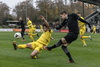 Den Zuschauern sollte hier bei frostigen Temperaturen viel Geboten werden. Gerade einmal 2 Minuten sind gespielt, als der VfB den frühen Rückstand hinnehmen muss. Nach einem Eckball kommt Imran Ali am langen Pfosten mit dem Kopf an den Ball und schafft es irgendwie den Ball durch die Beine von Nakamikawa, der den Pfosten abdeckt zu köpfen. Homberg erholt sich schnell von dem frühen Rückstand und kommt selber nach 7 Minuten zu einer Großchance. Addai ist zu schnell für seinen Gegenspieler und marschiert über die linke Seite. Der Monheimer Torwart kann den Abschluss abwehren, allerdings fliegt der Ball hoch durch den Strafraum zu Sakaki Ota, der den Ball aus der Luft nimmt, jedoch nur einen Gegenspieler trifft. Nach 16 Minuten dann der Ausgleich für Homberg. Toloupis dribbelt mit dem Ball quer vor dem Tor und spitzelt den Ball genau im richtigen Moment auf den startenden Ota, der keine Probleme hat, den Ausgleich zu erzielen. Die Antwort der Gäste dann im direkten Gegenzug. Lippold hat zu viel Platz auf der linken Seite, kann den Ball in den Strafraum spielen, wo die Gäste mit zwei weiteren Pässen, Tim Kosmala in Position bringen, der für die erneute Führung der Gäste sorgt. Was Monheim kann, können wir auch. Die direkte Antwort. Mit einem Freistoß von der linken Seite, findet Walker den Kopf von Asare am langen Pfosten. Ausgleich! In der 34. Spielminute dann sogar die Führung für den VfB. Addai dribbelt sich gut im Strafraum fest und kann nur durch ein Foul gestoppt werden. Touloupis tritt vom Punkt an und verwandelt sicher unten links zur Homberger Halbzeitführung.