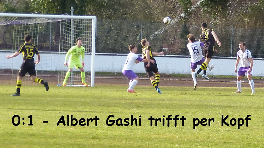 Nach dem Seitenwechsel gab es eine Schrecksekunde für die Gäste: Der in die tiefstehende Sonne guckende Martin Hauffe berechnete einen Flankenversuch von Soufian Rami nicht richtig, konnte den Ball aber mit einer tollen Reaktion noch an den Innenpfosten lenken und auch den Abpraller vom Tor weg bugsieren, ein Mitspieler besorgte den Rest. Ein guter Schuß von Oguzhan Cuhaci brachte nur eine Ecke ein, Tobias Schiek brachte Athanasios Mitrentsis in eine aussichtsreiche Position, doch Dominik Borutzki war einen Schritt schneller (50.). Nach zwei Ecken für die Gäste - Sebastian Schweers wurde nach Anspiel von Mitrentsis abgeblockt, auch nach Zuspiel von Schiek blieb der erneut überzeugend agierende Schweers zweiter Sieger. Dann aber schlug Kapitän Thomas Schlieter den Ball in den Strafraum, sein aufgerückter Innenverteidigungskollege Albert Gashi war mit dem Kopf zur Stelle und traf zum 0:1 - es war das zweite Tor des Abwehrspielers binnen einer Woche. Leider hatte die Führung nur drei Minuten Bestand, nach einer Stafette über vier Stationen konnte der mutterseelenallein stehende Oliver Rademacher den Ball aus acht Metern ins Tor wuchten. Sebastian Schweers hatte noch gute Szenen bei zwei Freistößen, einmal war er selbst gefoult worden, das andere Mal wurde Sunay Acar gelegt. Doch der Ball wollte nicht mehr ins Tor, es blieb bis zum Ende beim 1:1.