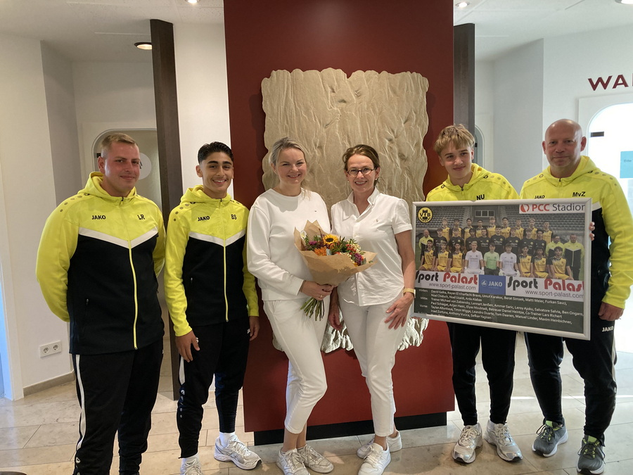 Vor der Saison erhielt die Mannschaft von der Zahnärztlichen Gemeinschaftspraxis Dr. Anja Ch. Erdmann, ZÄ Caroline Potyka & Kollegen zwei tolle neue Trikotsätze. Jetzt hatten Trainer Michael von Zabiensky, Co-Trainer Lars Richert sowie die Spieler Noel Uzaldi (Mannschaftskapitän) und Berat Simsek die Gelegenheit, sich bei dem Praxisteam für diese bärenstarke Aktion zu bedanken.