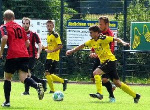 Trainer Stefan Janßen schickte die Elf auf den bei schwülwarmem Wetter bestens bespielbaren Rasenplatz, die schon am vergangenen Mittwoch beim abschließenden Testspiel gegen den SV Schermbeck begonnen hatte, nur im Tor stand Philip Gutkowski statt Fabian Groß. Die Gäste übernahmen von Anfang das Kommando, spielten sich den Ball zu, um im richtigen Moment auf Angriffsmodus umzuschalten. Marcel Kalski nach einer Flanke von Oguzhan Cuhaci (8.) und zwei Schüsse von Cuhaci nach Vorarbeit von Sergen Sezen (14.) und Stefan Schindler (22.) hätten die Führung bringen können, das gelang dann Kalski per wuchtigem Kopfball nach starker Flanke von Schindler (23.). Ein weit links am Pfosten vorbeifliegender Schuß von Steffen Scheike war die erste nennenswerte Offensivaktion der Gastgeber, doch gefährlicher waren Versuche von Sergen Sezen nach Anspiel von Joel Schoof (30.) sowie ein 30-Meter-Freistoß, den Cuhaci knapp über die Querlatte donnerte. Nach einem grandiosen Diagonalpaß von Dennis Wibbe konnte Stefan Schindler flanken, fand aber diesmal nicht den innen wartenden Marcel Kalski (41.). Wenig später vergab der VfB-Stürmer nach Hereingabe von Cuhaci per Kopf, Stefan Schindler verpaßte das 0:2 nach toller Kombination mit Dennis Wibbe ebenfalls. So ging es mit dem knappen 0:1 in die Kabinen.