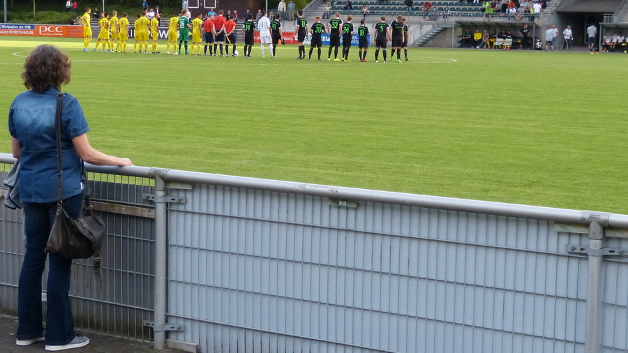 Nach dem Seitenwechsel wollten die Gäste dem Spiel eine Wende geben, aber die Homberger blieben klar überlegen. Immerhin konnte VfB-Keeper Philipp Gutkowski in der 52. Minute sein Können zeigen, als er eine Chance von Dennis Lerche zunichte machte. Eine Minute später war Timo Friede auf dem Posten und ließ Lerche erneut das Nachsehen. Danach brannte es wieder im Minutentakt vor dem Gästetor, doch vor allem der einsatzfreudige Marcel Kalski, dem alle VfB-Fans ein Tor gegönnt hätten, verzweifelte am starken Christopher Viertmann im Tor der DJK. Dann erkämpfte sich Dennis Wibbe im Mittelfeld den Ball, drang in den Strafraum ein und spielte uneigennützig Kalski an, der von hinten gefoult wurde. Der Schiedsrichter entschied auf Elfmeter und zeigte Jonas Schüler die rote Karte. Kapitän Sunay Acar ließ Viertmann keine Chance und es hieß 3:0. Die von Trainer Janßen 90 Minuten lang von der Seite dirigierten Gelb-Schwarzen wollten noch mehr und berannten das gegnerische Tor. Doch erst nachdem ein Freistoß von Dennis Lerche am Pfosten gelandet war, nutzte der eingewechselte Sebastian Santana den schnellen Gegenstoß zum 4:0. Nach dem Abpfiff war im PCC-Stadion große Zufriedenheit spürbar, nicht nur, weil der VfB Homberg den ersten Saisonsieg errungen hatte. Das Team hat heute nachgewiesen, daß es höchst ansehnlichen Fußball spielen und dabei Tore schießen kann. So darf es gerne weitergehen.