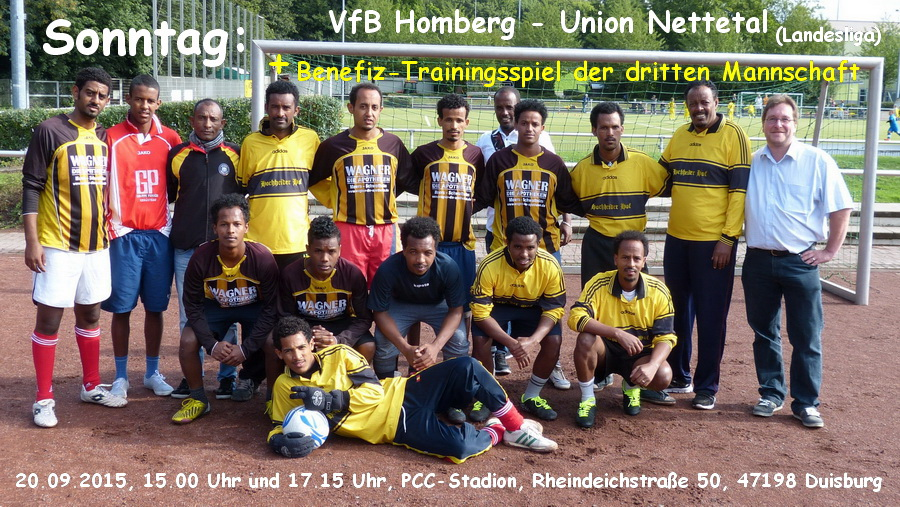 Eine halbe Stunden nach dem Abpfiff der Landesliga-Begegnung tritt unsere dritte Mannschaft zu einem ganz besonderen Trainingsspiel an, es geht um 17.15 Uhr auf dem Kunstrasenplatz gegen die "Auswahl Eritrea", dazu laden wir alle Fußballinteressierten herzlich ein. Als größter Fußballverein in Homberg ist sich der VfB seiner sozialen Verantwortung bewußt und stellt seit Juli einer Gruppe fussballbegeisterter Flüchtlinge aus Eritrea einmal wöchentlich einen Trainingsplatz zur Verfügung - am Sonntag kann man sich von den Fähigkeiten der Afrikaner ein Bild machen. Mehr dazu gibt es auf der Facebook-Seite unserer "Dritten" zu lesen: Klicken.