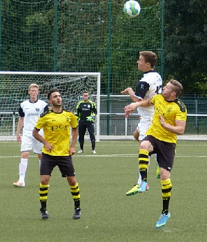 VfB-Trainer Günter Abel änderte die Startaufstellung gegenüber der Vorwoche: Für Ognjen Petrovic und Cengizhan Erbay standen Sunay Acar und Athanasios Mitrentsis auf dem Feld, der VfB Homberg agierte in einem 4-4-2-System. Die Gastgeber, die auf eine beeindruckende Heimserie zurückblicken können - inklusive der heutigen Partie ist man achtzehn Mal in Folge zuhause ungeschlagen -, begannen furios, Benjamin Schütz und Ömer Okyar hätten früh für das 1:0 sorgen können. Das fiel dann nach einer Viertelstunde, als Dalibor Cvetkovic von der linken Seite ungehindert flanken konnte und Schütz den Ball - obwohl hart bedrängt von den Homberger Innenverteidigern - gekonnt an Dominik Weigl vorbei ins Tor lenkte. Homberger Angriffe hatten Seltenheitswert, ein Kopfball von Thomas Schlieter nach einer Ecke von Mo Attris sowie ein Antritt von Dennis Konarski nach Anspiel von Jura Adolf weckten Hoffnungen bei den mitgereisten Fans, doch das war nur ein Strohfeuer. Torschütze Benjamin Schütz hatte mehrfach das 2:0 auf dem Fuß, die besten Möglichkeiten verhinderten Dominik Weigl und Patrick Polk. Kurz vor dem Pausenpfiff verfehlte Sven Raddatz frei vor Weigl das Tor aus sechs Metern, dann stand der Pausenstand fest.