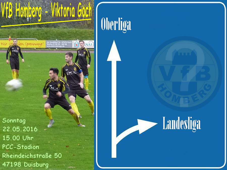 Eine tolle Saison spielt unsere Landesliga-Mannschaft, der zweite Tabellenplatz ist alles andere als Zufall: In bislang 31 Spielen gab es 20 Siege und 80 Tore zu verzeichnen - beide Zahlen sind Ligabestwert. 2016 stehen in dreizehn Partien elf Siege auf dem Konto, nur einmal verließen die Homberger als Verlierer den Platz. Um die gute Ausgangsposition im Kampf um den Aufstieg in die Oberliga zu behalten, muß am Sonntag gegen Viktoria Goch unbedingt gewonnen werden. Vom Papier her sollte das kein Problem sein, schließlich empfängt der Zweite den Vorletzten. Auch das Hinspiel läßt auf eine lösbare Aufgabe schließen, im Gocher Hubert-Houben-Stadion sorgten Marcel Kalski mit einem Fünferpack und Sergen Sezen für einen hochverdienten 6:0-Auswärtssieg. Doch Statistisches und Vergangenes zählen am Sonntag überhaupt nichts, es kommt einmal mehr darauf an, engagiert und konzentriert zur Sache zu gehen sowie den von Dennis Wibbe und Co. gewohnten Spielwitz an den Tag zu legen. Immerhin haben die Gäste am letzten Spieltag dem Spitzenreiter 1. FC Kleve mit einem 1:1 einen Punkt abgeknöpft, das Team von Trainer Stefan Janßen sollte gewarnt sein.