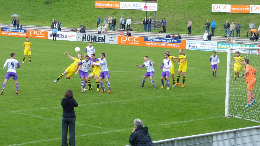 Trainer Günter Abel änderte einiges gegenüber der Vorwoche, vor allem überraschte der Einsatz von Oguzhan Cuhaci. Hombergs bester Torvorbereiter der letzten beiden Spielzeiten ist kurzfristig vom SV Hönnepel-Niedermörmter an den Rheindeich zurückgekehrt. Im rechten Mittelfeld kam Tobias Schiek nach langer Verletzungspause zum Einsatz, Hakan Dönmez und Athanosios Mitrentsis blieben draußen. Nachdem kurz nach dem Anpfiff ein Freistoß von der Hiesfelder Abwehr geklärt werden konnte, fand das Spiel überwiegend in der Homberger Hälfte statt. Thomas Schlieter klärte per Kopf gegen Joel Schoof (5.), Patrick Polk war gegen Kevin Menke auf dem Posten. Nachdem Almir Sogolj einen Paß von Muhamet Attris in die Wolken hämmerte, landete ein weites Anspiel von Michael Ohnesorge bei Danny Rankl, der ehemalige Sonsbecker setzte sich gegen Schlieter, Polk und Keeper Weigl durch und traf zum 0:1. Die Gäste hätten nachlegen können, doch Menke wurde von Oguzhan Cuhaci abgeblockt (20.), Dominik Weigl blieb in einer 1:1-Situation gegen den von Gino Mastrolonardo freigespielten Dennis Hecht Sieger. Auch nachdem Rankl von der rechten Seite auf Menke flanken konnte, fing Weigl den Ball noch ab. Nach einer guten halben Stunde waren dann auch Aktionen im Hiesfelder Strafraum zu verzeichnen, einen langen Ball von Cuhaci nahm Almir Sogolj direkt, der Ex-Homberger Kevin Hillebrand hielt mühelos. Auch nach einer Flanke von Tobias Schiek scheiterte Sogolj am Keeper (33.), einen Kopfball von Jura Adolf nach einer Attris-Ecke parierte Hillebrand ebenfalls. Kurz vor dem Pausenpfiff waren wieder die Gäste am Zug, Dennis Hechts Antritt führte dank des Eingreifens von Thomas Schlieter nur zu einer Ecke (43.), eine scharfe Flanke von Hecht landete in den Händen von Dominik Weigl. So ging es mit dem 0:1 zum Pausentee.