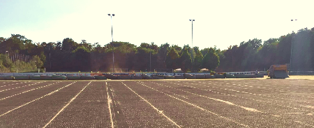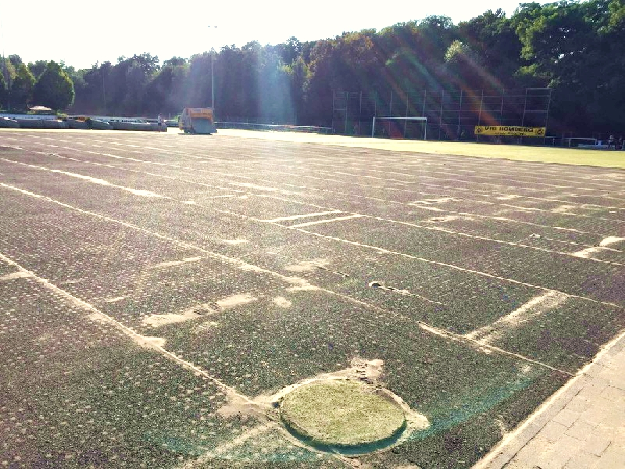 | So sieht es unter dem Kunstrasen aus. Fühlt sich an wie eine Leichtathletikbahn. Hinten: Die bereits aufgerollten Bahnen. |