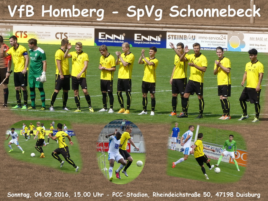 Mit der Spielvereinigung Schonnebeck 1910 erwartet der VfB Homberg am Sonntag ein Team im PCC-Stadion, das im Vorjahr als Aufsteiger für Furore gesorgt hat und derzeit auf dem besten Weg ist, sich in der Oberliga als Spitzenteam zu etablieren. Im Essener Nordosten wird offensichtlich gute Arbeit geleistet, Trainer Dirk Tönnies - seit Ende 2008 im Amt - schickt mit Erfolg eine funktionierende Mischung aus gestandenen Oberliga-Spielern und Schonnebecker Urgesteinen auf das Feld. Daß Tönnies - Bruder der MSV-Profi-Legende Michael Tönnies - und unser Coach Stefan Janßen beim FC Schalke 04 und bei Schwarz-Weiß Essen gemeinsam aktiv waren, ist für Sonntag bedeutungslos: Geschenke werden nicht verteilt. Die Gäste wollen den dritten Tabellenplatz festigen, der VfB Homberg will seinen Status als bester Aufsteiger manifestieren. Das Potential ist auf beiden Seiten vorhanden, wir hoffen auf das bessere Ende für die Gelb-Schwarzen - aber das wird verdammt schwer.