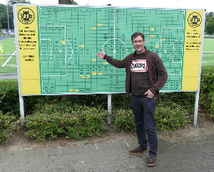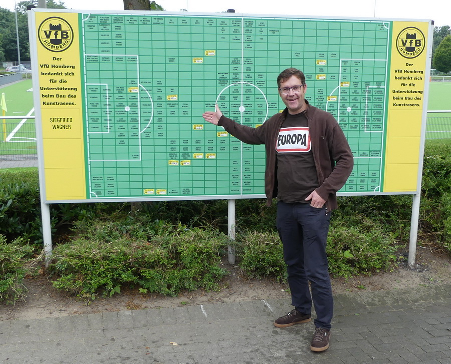 | Beeindruckend groß: Die Tafel zum Projekt Kunstrasenplatz II |