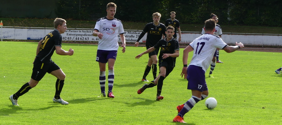 Trainer Stefan Janßen fehlten an alter Wirkungsstätte weiterhin Mike Koenders und Jerome Manca, auch Metin Kücükarslan mußte krankheitsbedingt passen. Justin Bock saß nach seiner Kopfverletzung aus dem Velbert-Spiel anfangs auf der Bank, wirkte aber erfreulicherweise die letzten zwanzig Minuten mit. Die Gastgeber legten bei angenehmem Spätsommerwetter furios los, die Abwehr um den bestens aufgelegten und 90 Minuten lang konsequent "abräumenden" Timo Welky hatte jede Menge zu tun. Doch schon nach vier Minuten schnappte sich Ferdi Acar den Ball, lief in die gegnerische Hälfte und bediente auf der rechten Seite Valdet Totaj - Dennis Wibbe hatte keine Mühe, dessen präzise Hereingabe zu verwerten. Nach einer Viertelstunde legten die Gäste das 0:2 nach, Jonas Haub brachte den Ball von rechts vors Tor, Julien Rybacki fackelte nicht lange und traf. Acht Minuten später hätte es sogar 0:3 stehen müssen, doch der allein auf TV-Keeper Joel Drepper zulaufende Wibbe schoß den Torwart an, der Nachschuß von Julien Rybacki wurde zur Ecke abgewehrt. Statt dessen fiel das 1:2 durch einen von Hiesfelds Kapitän Kevin Menke verwandelten Foulelfmeter, der an der Strafraumgrenze unnötigerweise verursacht worden war. Danijel Gataric hatte den Ausgleich auf dem Fuß, Philipp Gutkowski und Timo Welky klärten in letzter Sekunde mit vereinten Kräften. Mit Glück und Geschick verteidigten die Gelb-Schwarzen bis zum Pausenpiff die knappe Führung.