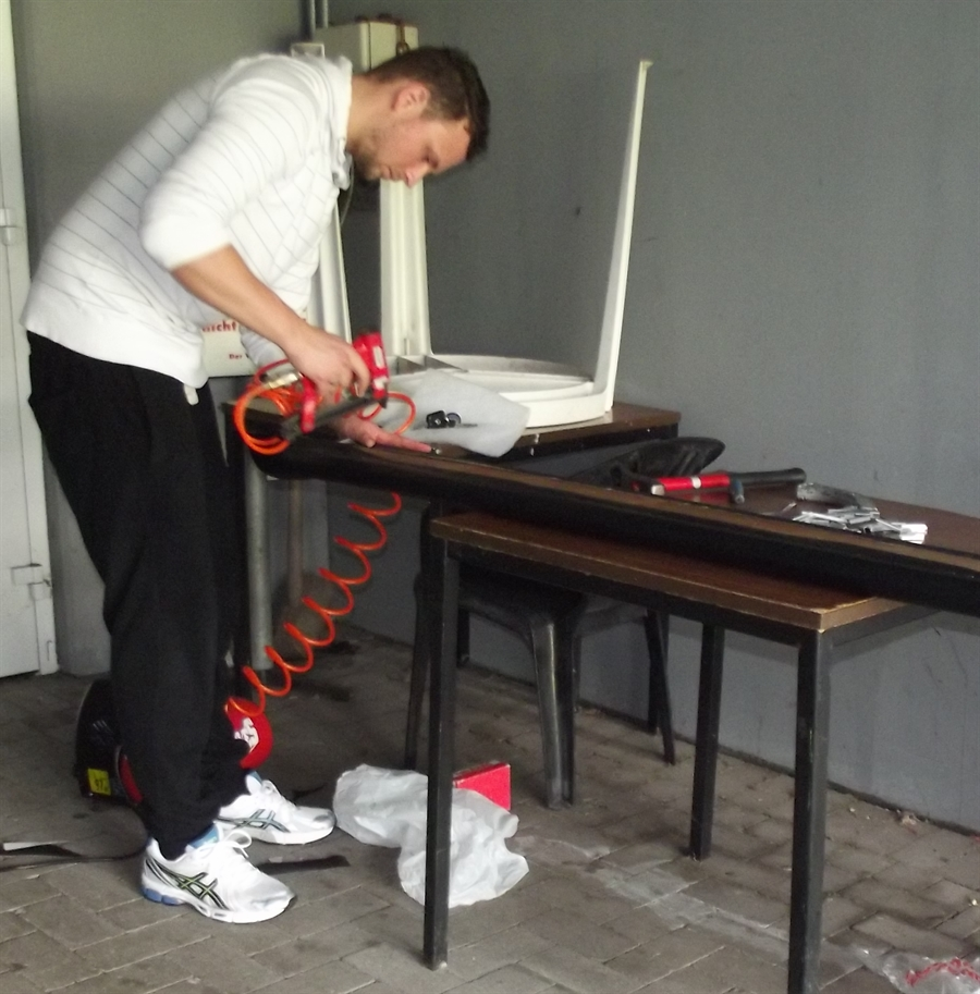 Mit viel Engagement hängt sich Dirk "Stubbel" Thiedge in die Arbeit. Die Bank erhält auch eine Neue Polsterung.