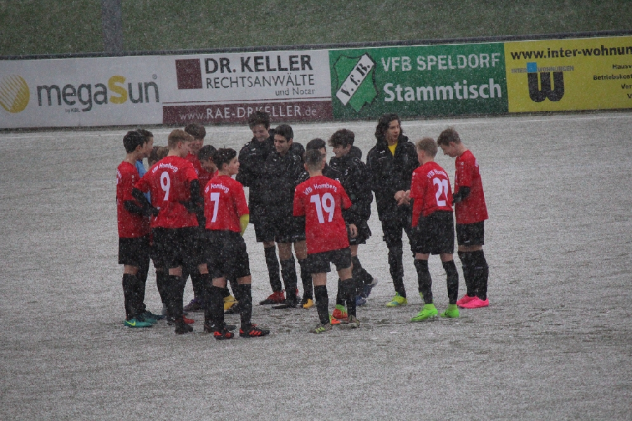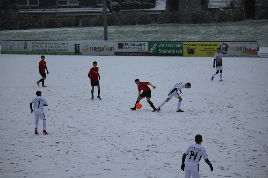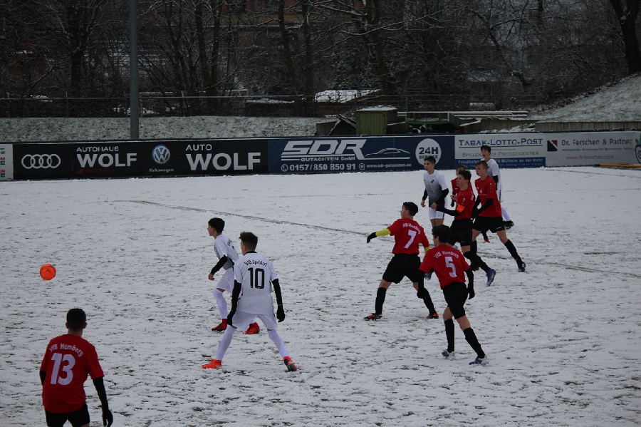 Heute absolvierten wir ein Testspiel bei der C1 vom VfB Speldorf die in der Leistungsklasse im Kreis Duisburg spielen. Kurz vor Spielbeginn öffnete Frau Holle ihre Tore und es fing an zu schneien so das sich der Platz in eine Winterlandschaft verwandelte. Dadurch waren die Bedingungen für beide Mannschaften sehr schwierig und unser Team könnte daher nicht ihr gewohntes Pass- und Kombinationsspiel durchziehen wie gewohnt. Zudem spielten wir in der ersten Hälfte zu pomadig und unkonzentriert. Trotzdem hatten wir einige klare Chancen die aber teilweise leichtfertig vergeben wurden. So ging es torlos in die Halbzeit. In der zweiten Hälfte wurden die Platzverhältnisse nicht besser aber von der Einstellung und vom Einsatz her war nun eine andere Homberger Elf zu sehen. Allerdings gerieten wir nach einem individuellen Fehler in Rückstand. Doch dann zeigten die Jungs ihre Klasse. Unbeirrt vom Rückstand und mit großem Willen drehten sie das Spiel und gewannen letzendlich auch nach einer nicht so guten ersten Hälfte verdient mit 3:1. Glückwunsch!