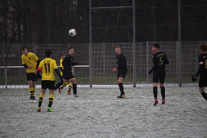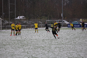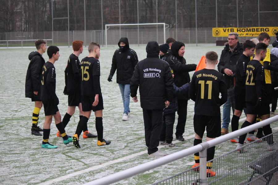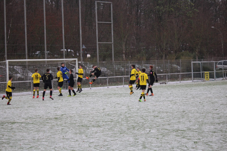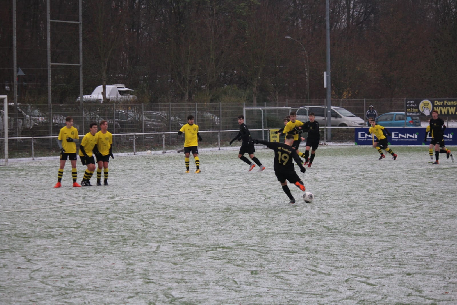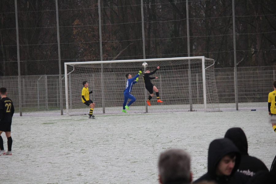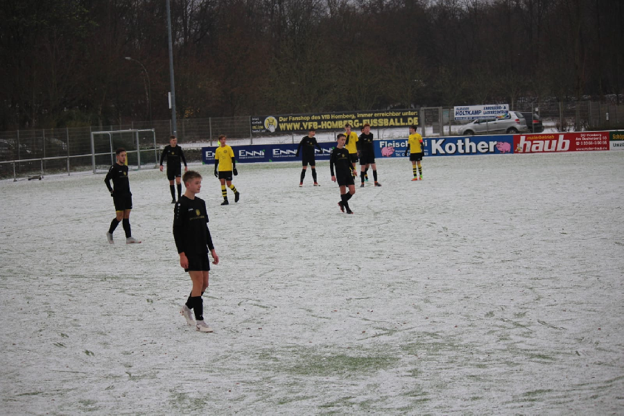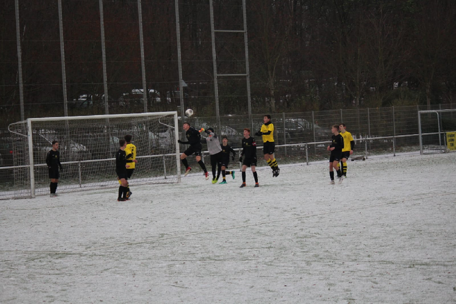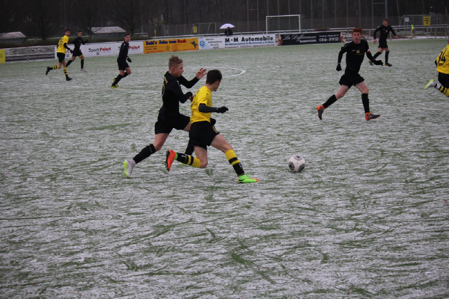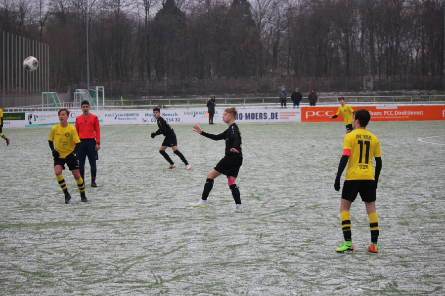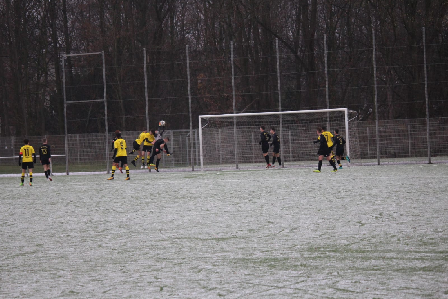 Bei winterlichem Wetter und einem leich mit Schnee bedeckten Boden empfingen wir heute im ersten Rückrundenspiel vor der Winterpause die Elf vom GSV Moers. Nach zwei klaren Siegen im Pokal und im Hinspiel hatten wir heute deutlich mehr Mühe. Trotz der widrigen Platzverhältnissen kamen wir gut in die Partie hinein und erzielten schnell die Führung. Diese hielt aber nur kurz und nach einer Ecke glichen die Gäste aus. Obwohl wir in der Folgezeit trotz einer mäßigen fußballerischen Leistung eine Vielzahl an Torchancen hatten konnten wir nur einen weiteren Treffer erzielen. Anstatt mit einer klaren Führung in die Halbzeit zu gehen fiel kurz vor der Pause nach einer Unaufmerksamkeit im Defensivverhalten tatsächliche der Ausgleich. Nun witterten die Gäste gar ihre Chance heute etwas zählbares mit nach Hause zu nehmen. In der zweiten Hälfte standen sie kompakt und gut geordnet in ihrer Hälfte und machten es unserer Elf mehr als schwer. So dauerte es bis neun Minuten vor Spielende bis der erlösende Treffer zum 3:2 für uns fiel. Kurz vor Schluss konnten wir noch ein weiteres Tor zum 4:2 Heimerfolg erzielen. Trotz der etwas schwächeren Leistung am heutigen Tage schmeckte das anschließende Weihnachtsessen und man kann den Jungs nur ein Lob für die sehr gute Hinrunde aussprechen! Allen Zuschauern, Freunden und Gönnern wünscht die U17 schöne Weihnachtstage und einen guten Rutsch ins neue Jahr!!!