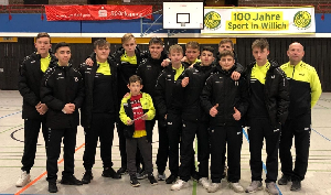 Heute absolvierten wir ein Hallenturnier beim Gastgeber DJK/VFL Willich. Bei sieben teilnehmenden Mannschaften im Modus jeder gegen jeden konnte unser Team in den ersten fünf Spielen alle Spiele verdient und mit teils hohen Ergebnissen gewinnen. Im letzten Spiel ging es dann um den Turniersieg gegen die Mannschaft vom Rather SV aus der Leistungsklasse von Kreis Düsseldorf. Aufgrund des besseren Torverhältnis reichte uns ein Unentschieden. Doch unsere Mannschaft zeigte bis zwei Minuten vor Schluss eine schwache Leistung und lag 1:4 zurück. Doch die Jungs gaben nicht auf und zeigten Kämpferherz und erzielten tatsächlich neun Sekunden vor Spielende den nicht mehr für möglich gehaltenen Treffer zum 4:4 Endstand. Damit holten wir uns etwas glücklich aber insgesamt verdient den Turniersieg. Glückwunsch!