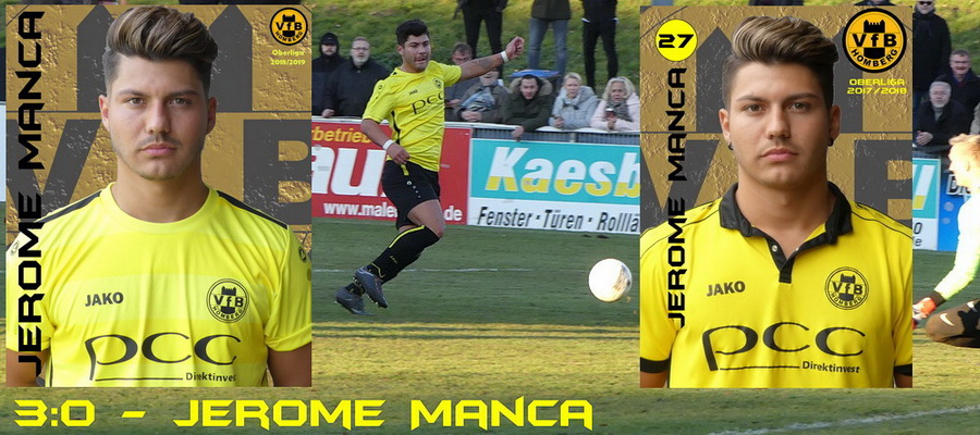 Kaum ist mit Jonas Haub der erste Sommer-Abgang unserer Oberliga-Mannschaft vermeldet worden, da folgt die nächste Nachricht: Auch Jerome Manca wird sich im Sommer vom VfB Homberg verabschieden und sich dem Landesligisten TuS Fichte Lintfort anschließen. Der 23 Jahre alte und auf der linken Seite vorne wie hinten einsetzbare Spieler kam im Sommer 2016 vom KFC Uerdingen und wurde auf Anhieb Stammspieler. Im Vorjahr verpaßte er verletzungsbedingt die Hälfte der Meisterschaftsspiele, in der laufenden Spielzeit hat er bislang in siebzehn von 22 Spielen mitgewirkt und dabei vier Treffer erzielt.