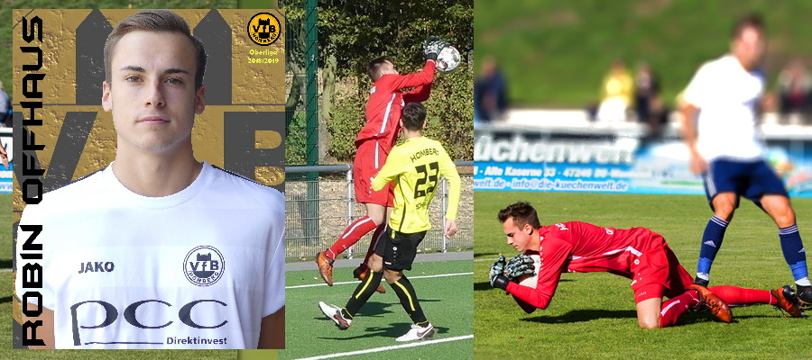 Der 20 Jahre alte Robin Offhaus ist im vergangenen Sommer vom VfB Speldorf an den Rheindeich gekommen, zuvor stand er in seiner Heimatstadt in der A-Junioren-Bundesliga für Fortuna Düsseldorf zwischen den Pfosten. Nach der schweren Verletzung von Philipp Gutkowski stellte Offhaus in zehn Partien sein Können derart überzeugend unter Beweis, daß nach der Winterpause der Zweikampf um den Stammplatz im Tor neu ausgetragen wurde. Der VfB Homberg kann sich freuen, auch 2019/2020 auf drei bärenstarke Keeper zurückgreifen zu können.