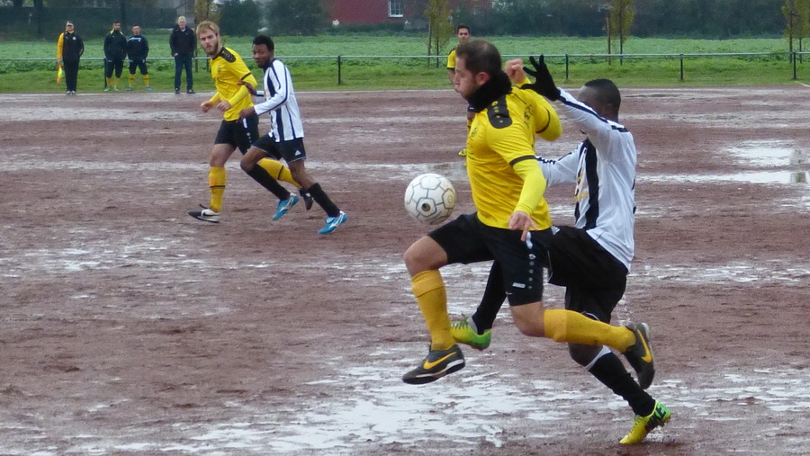 Die Gäste begannen auf dem von Pfützen übersäten und dementsprechend schwer bespielbaren Aschenplatz selbstbewußt, Enes Balci - neben Torwart Fabian Groß die zweite "Leihgabe" aus dem Oberliga-Kader - hatte bereits nach drei Minuten das 0:1 auf dem Fuß, schoß aber am Tor vorbei. Wenig später brachte Janis Timm einen Freistoß von der linken Seite an den Fünfmeterraum, Robin Spicker lenkte den schlecht abgewehrten Ball ins Tor. Die Gastgeber aber zeigten sich nicht geschockt und hatten Chancen, Ekrem Duljaj mußte auf der Linie retten (10.). Dann wurde ein Kopfball von Oguzhan Aslan mit Mühe zur Ecke abgewehrt, die Arslan selbst mit dem Kopf zum Ausgleich ins Netz lenkte. Doch nur drei Minuten später führte der nächste Freistoß von Janis Timm zur erneuten Gästeführung, der Abwehrversuch von Nana Amponsah Sefa landete als Bogenlampe im eigenen Netz. Eine tolle Aktion von Faruk Yildirim hätte das 1:3 bringen können, doch nach einem spektakulären Alleingang blieb Keeper Mehmet Coskun Sieger - hier wäre ein Abspiel auf die freistehenden Robin Spicker oder Enes Balci die bessere Lösung gewesen. Nachdem Stefan Schindler in der 28. Minute nach einem energischen Sprint über das Tor geschossen hatte, war er am 1:3 beteiligt: Nach Anspiel von Bekir Acuner setzte Schindler Robin Spicker in Szene, der Ball landete im Tor - der gute Schiedsrichter Sascha Radusch wertete die Aktion als Eigentor von Semih Altun. Die letzte Chance im ersten Durchgang hatten die nie aufsteckenden Gastgeber, Kapitän Ahmet Bayram köpfte nach einer Ecke knapp vorbei.