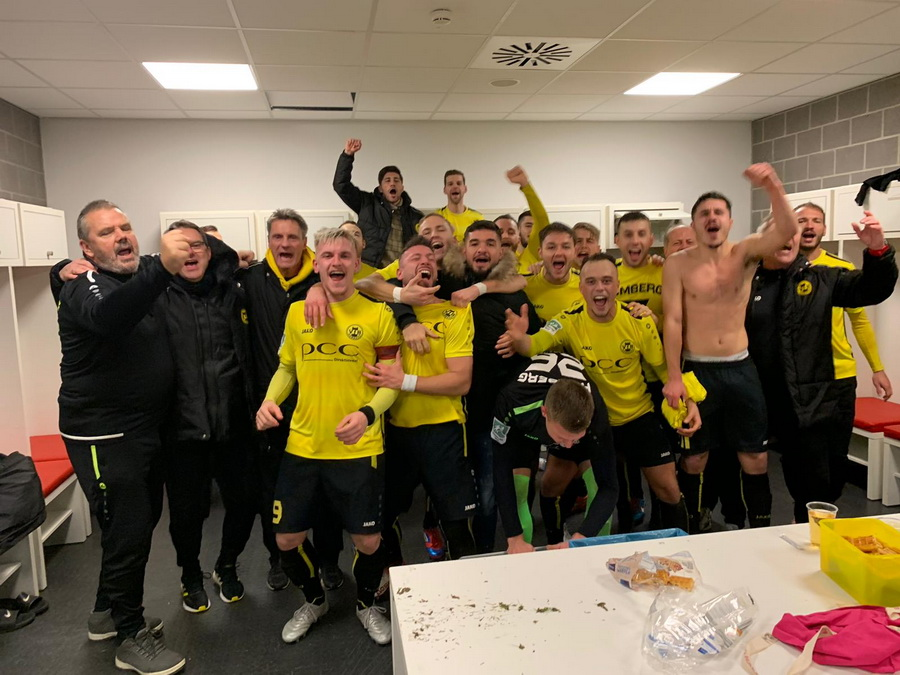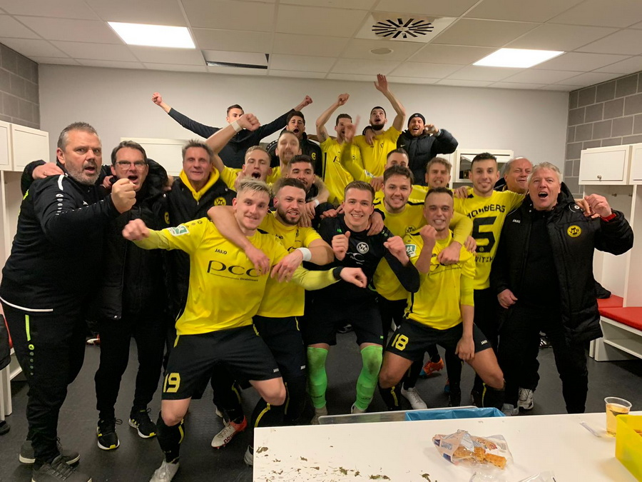 Vielen Dank an unsere Mannschaft für den tollen Freitagabend! Und vielen Dank an Trainer Stefan Janßen, der uns mit zwei Fotos an den Feierlichkeiten in der Gästekabine des Stadion Essen teilhaben läßt.