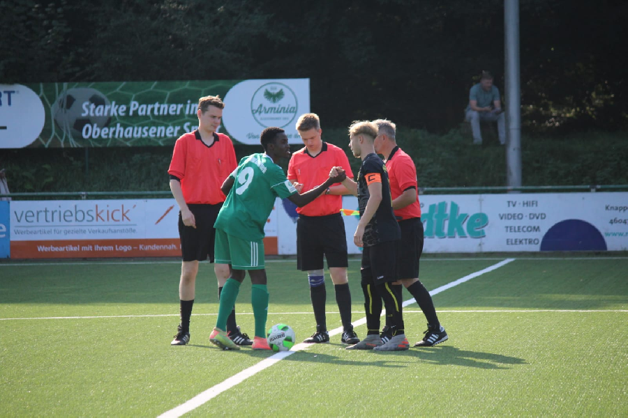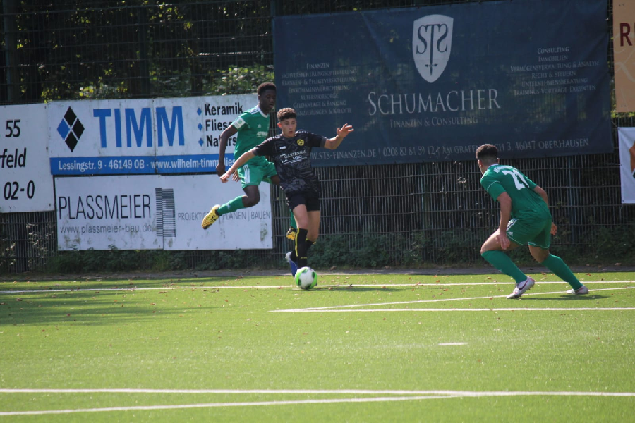 Heute musste unsere U19 bei der ambitionierten Mannschaft von Arminia Klosterhardt antreten. Nach dem guten Saisonstart wollte unser Team auch heute punkten und ging dementsprechend motiviert und engagiert in die Begegnung hinein. Dementsprechend gingen wir bereits nach wenigen Spielminuten in Führung. Anschließen hatten wir die Begegnung weiter im Griff, versäumten aber das Ergebnis auszubauen. So ging es dann mit einer knappen Führung in die Pause. Nach der Pause versuchte Klosterhardt direkt Druck auf unser Tor aufzubauen. In der 55. Minute dann ein kurzer Schockmoment für unser Team. Nach einem Zusammenprall mit dem Torwart der Gastgeber blieb unser Spieler bewusstlos auf dem Boden liegen. Nach schneller Erstbehandlung und anschließendem Abtransport mit dem Krankenwagen ist der Spieler wieder bei Bewusstsein und auf dem Wege der Besserung. Nach knapp 15-Minütiger Unterbrechung ging es dann weiter. Unsere Elf hielt dem Druck der Gastgeber durch eine sehr gute läuferische und kämpferische Vorstellung stand und bis auf zwei brenzlige Situationen ließ man hinten wenig zu. Kurz vor Schluss konnten wir dann endlich nach einem Konter auf 2:0 erhöhen. Dabei blieb es bis zum Schlusspfiff. Mit diesem Erfolg setzt sich unsere U19 erstmal in der Spitzengruppe der Niederrheinliga fest und bleibt ungeschlagen. Glückwunsch!