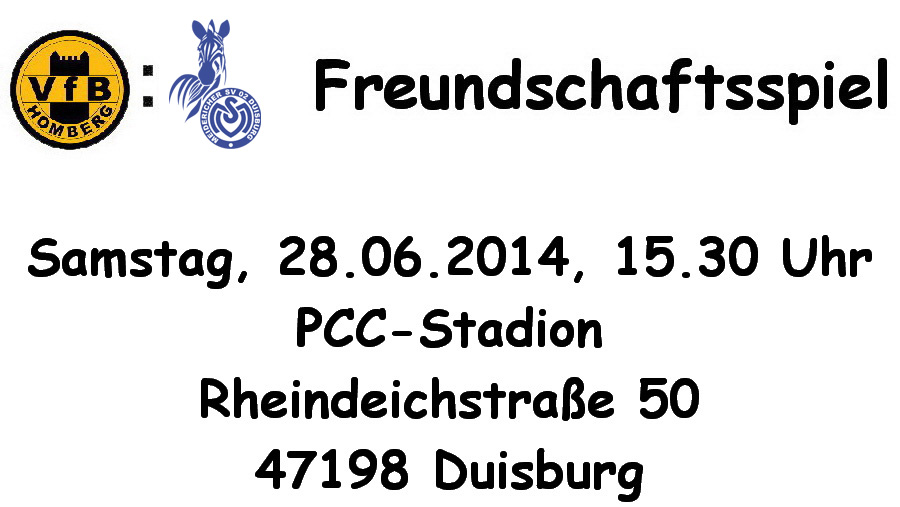 Am kommenden Samstag, den 28.06.2014, um 15.30 Uhr erwartet Oberligist VfB Homberg den Drittligisten MSV Duisburg zum Stadtderby im PCC-Stadion, für beide Mannschaften ist es der erste Auftritt mit den aktuellen Kadern für die Spielzeit 2014/2015, der neue MSV-Trainer Gino Lettieri steht erstmals an der Seitenlinie. Schon vor einem Jahr war dieses Derby ein Highlight im Vorbereitungsprogramm, zu dem sich 2.500 Zuschauer eingefunden hatten und das die Gäste von der Wedau mit 2:1 knapp für sich entscheiden konnten.