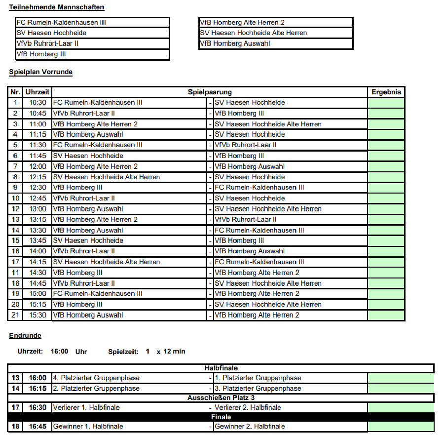 Das Starterfeld schmückt neben den Gastgebern der DRITTEN natürlich auch der SV Haesen/Hochheide. Dazu kommen noch die Jungs von Ruhrort Laar II, Rumeln-Kaldenhausen III und die Alten Jungs von Haesen/Hocheide sowie von VfB Homberg 2. Tradition ist auch schon, dass sich auch eine Handballauswahl des VfB Homberg unter dem Teilnehmerfeld tummelt.
