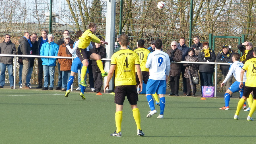 Auf dem Kunstrasenplatz "Am Berg" begannen die Gäste gar nicht schlecht, ein Freistoß von Oguzhan Cuhaci nach einem Foul an Sebastian Schweers flog nach vier Minuten am Tor vorbei. Ein Angriff über Kevin Hagemann und Philipp Schmidt endete bei Martin Hauffe, dann nutzten die Homberger nach starker Aktion von Dennis Konarski und Sebastian Schweers ein Durcheinander im Velberter Strafraum nicht aus. Nach einem tollen Diagonalpaß von Konarski wurde Oguzhan Cuhaci abgeblockt, beim Gegenzug entwischte Kevin Hagemann Fabian Hastedt und knallte den Ball aus kurzer Distanz ins lange Eck. Danach wurde der Favorit deutlich stärker, nach Vorarbeit von Hagemann zielte David Müller knapp vorbei, Martin Hauffe lenkte einen Schuß von Müller glänzend über die Querlatte. Nachdem Thomas Schlieter in höchster Not auf der Linie retten konnte, pfiff der Schiedsrichter auf der anderen Seite einen Foulelfmeter: Patrick Polk wurde von Marvin Mühlhause unfair attackiert, möglicherweise außerhalb des Strafraums. Sunay Acar übernahm wie gewohnt die Verantwortung, doch Velberts Keeper Philipp Sprenger wehrte den Ball ab. Wenig später schlug Kevin Hagemann Fabian Hastedt den Ellbogen an den Kopf - die rot-würdige Aktion wurde nicht geahndet -, Martin Hauffe verhinderte das zweite Gegentor. Hastedt wurde mit Verdacht auf Gehirnerschütterung ins Krankenhaus gebracht, immerhin wünschte man nach dem Abpfiff von offizieller Velberter Seite alles Gute für Fabian Hastedt - wir schließen uns dem natürlich an. Der eingewechselte Jura Adolf lief in der 35. Minute nach Zuspiel von Tobias Schiek allein auf das Velberter Tor zu, schoß aber deutlich vorbei. Besser machten es die Blauen: Marvin Mühlhause setzte sich auf der linken Seite durch, sein Zuspiel verwertete David Müller zum 2:0 - in dieser Szene verletzte sich Dennis Konarski, der durch Cengizhan Erbay ersetzt wurde. Albert Gashi und Martin Hauffe waren dann noch in höchster Not auf dem Posten, so daß es mit dem 2:0 in die Kabinen ging.