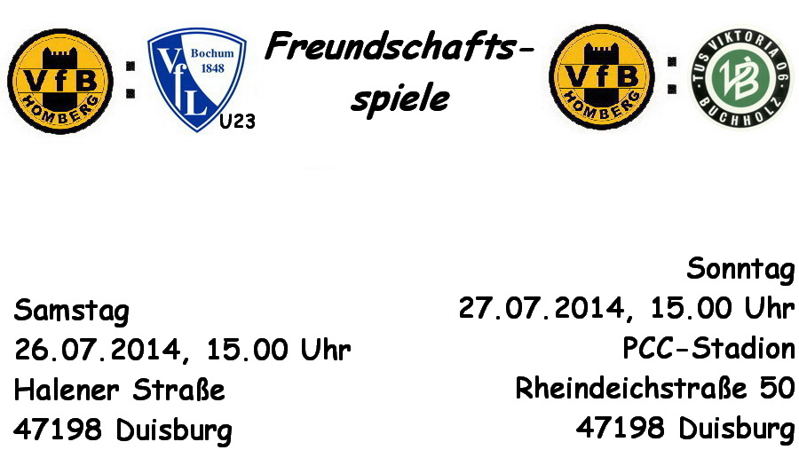 Am Wochenende stehen für unsere Oberliga-Mannschaft die Vorbereitungsspiele sechs und sieben auf dem Programm, bei denen sich die Fans ein aktuelles Bild von der Entwicklung der gelb-schwarzen Truppe machen können. Regionalligist VfL Bochum U23 ist am Samstag um 15.00 Uhr auf der Sportanlage des SV Haesen/Hochheide an der Halener Straße zu Gast, am Sonntag um 15.00 Uhr kommt Viktoria Buchholz ins PCC-Stadion (Kunstrasenplatz). Zwei Wochen und vier Testbegegnungen bleiben VfB-Trainer Günter Abel und seinen Kollegen Volker Abel, Stephan Rittmann und Oliver Adler noch, um aus dem neuen Kader eine schlagkräftige Einheit zu formen, das Potential des Teams war gegen die schwersten Gegner, die Profis von MSV Duisburg und VfL Bochum, deutlich erkennbar. Zuletzt machten sich die hohen Trainingsbelastungen bemerkbar, auch das verletzungsbedingte Fehlen mehrerer Spieler wirkte sich negativ aus. Dem stellt sich das Trainerteam ohne zu klagen und arbeitet zusammen mit der Mannschaft weiter akribisch auf den Saisonstart am 10.08.2014 (Heimspiel gegen SSVg. Velbert) hin.