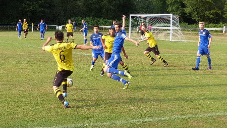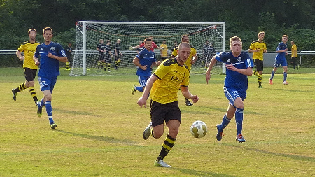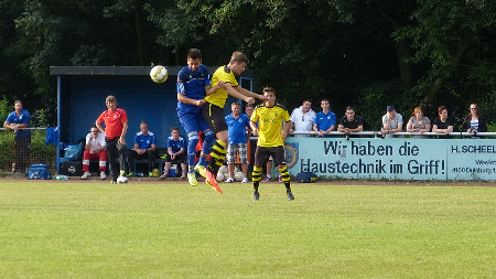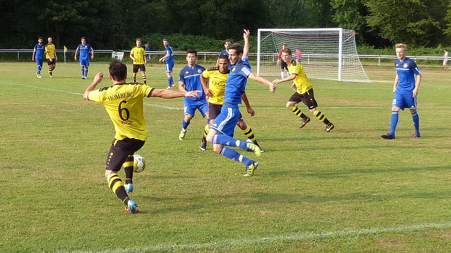 Sie brauchten ihr Kommen nicht zu bereuen, die Zuschauer beim Homberger Lokalderby zwischen dem B-Ligisten SV Haesen/Hochheide und dem Oberligisten VfB Homberg. Am Ende hieß es standesgemäß 6:2 für die Gäste - Held des Tages war aber mit dem Doppeltorschützen Nils Krützberg ein "Blauer".