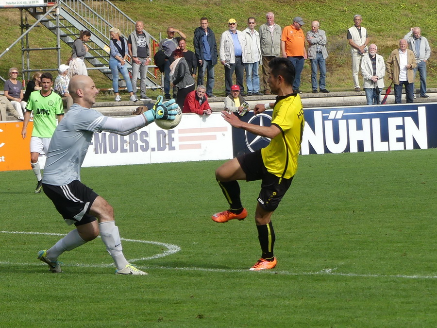 Der mit Westfalia Herne in Berlin am DFB-Ü40-Cup teilnehmende VfB-Trainer Stefan Janßen wurde von Michael Pomp vertreten, der seit Saisonbeginn für den VfB als Scout tätig ist und die Cronenberger im Vorfeld beobachtet hatte. Der Coach mußte neben den nach wie vor fehlenden Cengizhan Erbay, Eric Holz, Sebastian Santana und Burak Yerli auch auf Marcel Kalski verzichten, der Goalgetter leidet an einem Ermüdungsbruch. Florian Witte begann als Zehner, Dennis Wibbe spielte im linken Mittelfeld, Yusuke Unoki stand als Stürmer in der Startelf. Auch im Tor gab es einen Wechsel: Dario Roberto löste den an den Folgen einer Lebensmittelvergiftung leidenden Philipp Gutkowski ab. Die Gastgeber versuchten vom Anpfiff an, den Gegner unter Druck zu setzen, doch das klappte lange nicht. Statt dessen mußte Kapitän Thomas Schlieter mit einer starken Grätsche eingreifen, wenig später trafen die Grün-Weißen die Latte. Die Homberger Angriffsversuche verpufften leider, Keeper Dario Roberto verhinderte nach einem 45-Meter-Schuß von Marvin Mühlhause mit den Fingerspitzen das 0:1. Auch Timo Welky zeigte sich gegen Laslo Müllner auf dem Posten, bevor auf der anderen Dennis Wibbe mit unfairen Mitteln gebremst wurde. Torlos ging es in die Kabinen.