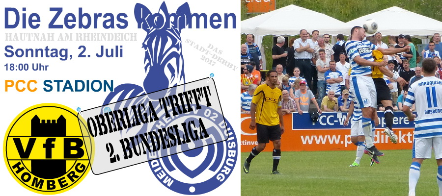 Die Sommerpause ist zu Ende - am Sonntag erwartet Oberligist VfB Homberg die Profimannschaft des MSV Duisburg zum Freundschaftsspiel im PCC-Stadion. Die Gäste, die vor wenigen Wochen den Wiederaufstieg in die zweite Bundesliga feiern konnten, haben den Trainingsbetrieb längst aufgenommen. Das Team von Trainer Ilia Gruev hat auch schon zwei Spiele bestritten: Gegen eine Duisburger Stadtauswahl gewann man 6:1, der westfälische Landesligist VfB Günnigfeld wurde 9:0 besiegt. Die Gelb-Schwarzen gehen dagegen nach gerade mal zwei Trainingseinheiten in die Partie, dennoch wird der bekennende MSV-Fan Stefan Janßen zusammen mit seinen Co-Trainern Peter Cernuta und Michael Pomp versuchen, die Mannschaft - darunter ein knappes Dutzend neuer Spieler - optimal auf die schwere Aufgabe einzustellen. Es wird sicherlich ein reizvolles Spiel, wir hoffen auf eine gute Kulisse.