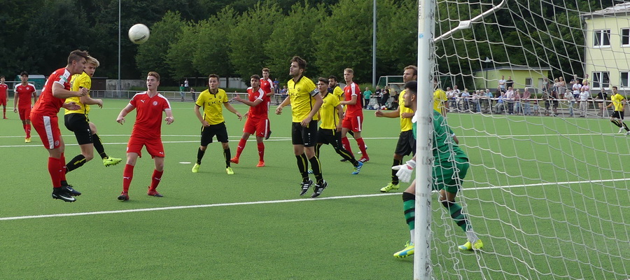 Gegen die U19 von Rot-Weiss Essen, die sich als Absteiger aus der A-Junioren-Bundesliga den direkten Wiederaufstieg auf die Fahnen geschrieben hat, hat unsere Oberliga-Mannschaft heute ein Testspiel bestritten. Nach täglichen Trainingseinheiten seit dem 30.06.2017 waren die Gastgeber erkennbar müde, die Gäste präsentierten sich spielstark und zielstrebig. Am Ende hieß es leistungsgerecht 1:1, mehr als über das Ergebnis wurde am Ende über den Platzverweis von Timo Welky gesprochen, der während der Halbzeitpause im Kabinengang die rote Karte sah.