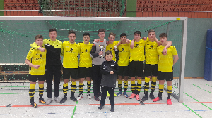 Unser Team knüpfte heute an die erfolgreiche Hinrunde im alten Jahr an und holte sich völlig verdient den Turniersieg in der Halle von SUS Dinslaken 09. Bei zwölf teilnehmenden Mannschaften gewannen unsere Jungs alle sechs Spiele. Glückwunsch!