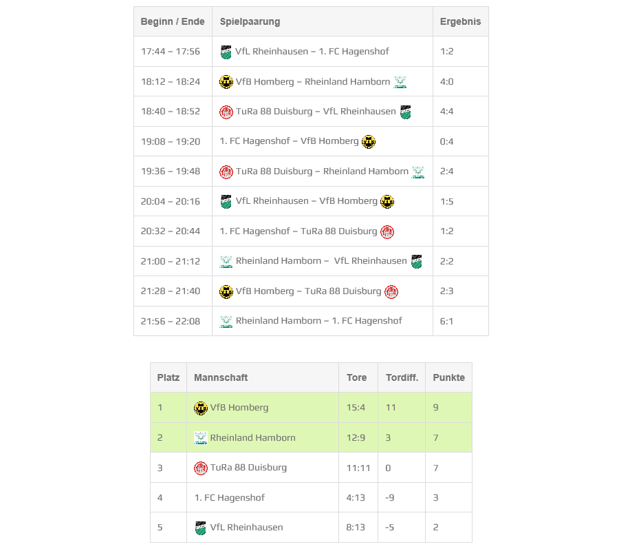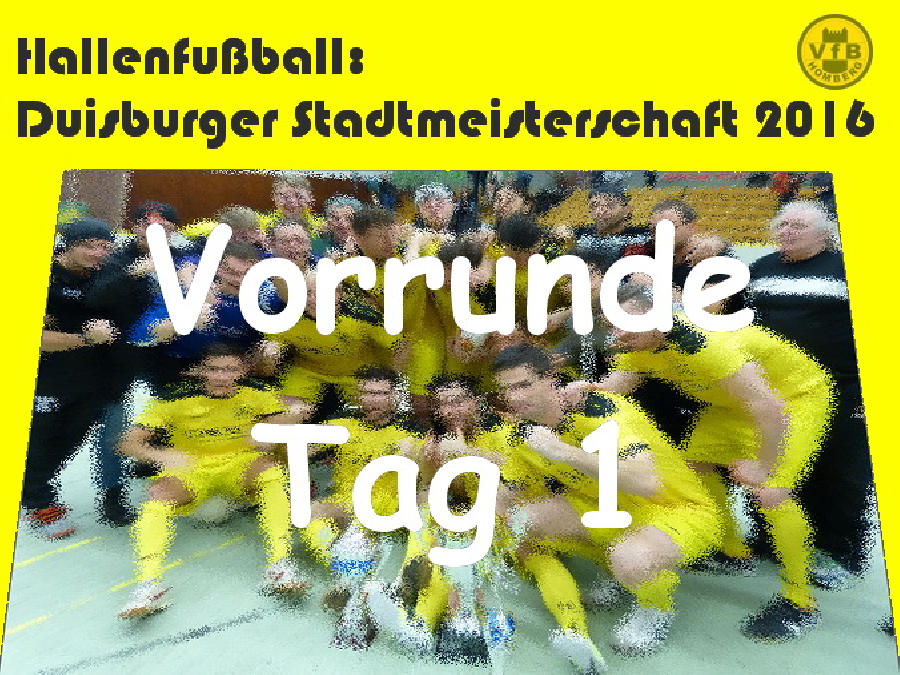 Heute stand der erste Spieltag der 30. Duisburger Stadtmeisterschaft im Hallenfußball auf dem Programm, Titelverteidiger VfB Homberg erreichte dabei als Gruppensieger die Zwischenrunde. Am Samstag geht es in Gruppe II weiter, die Gegner werden morgen ermittelt. Mit Timo Welky gehörte übrigens einer der drei Winterneuzugänge zum Kader von Trainer Stefan Janßen.